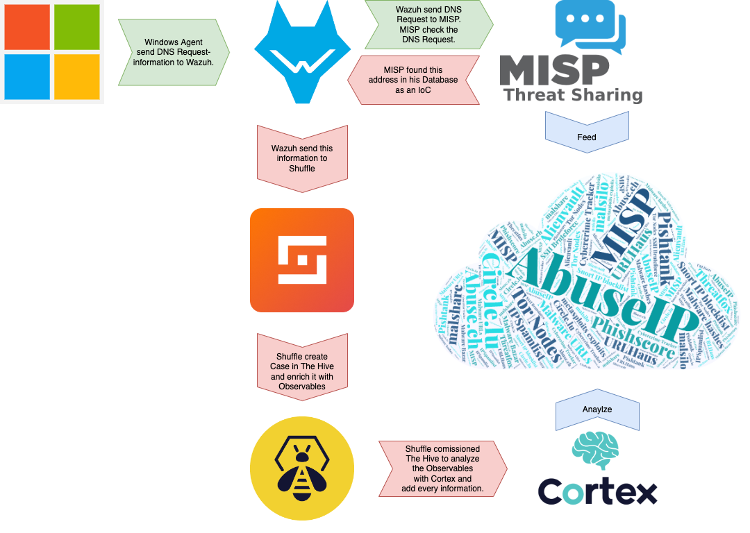 The Hive ist ein SIRP, hier werden alle Informationen gemeldet und weiterverarbeitet. Mit Hilfe unserer automatisierungsplattform Shuffel sammeln wir alle IoCs ein und übergeben diese an Cortex, unserem Analyzer - der wieder rum nutzt mehrere Systeme wie MISP, Virustotal, AbuseIP usw. um dort Informationen zu sammeln und diese in dem Vorgang in The Hive anzureichern.